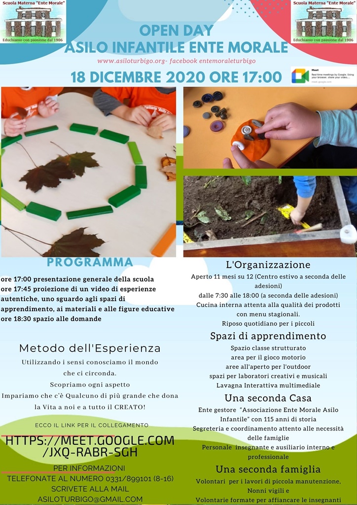 Siamo la scuola dell’infanzia paritaria “Asilo Infantile Ente Morale” di Turbigo, offriamo un servizio educativo per i bimbi dai 2 anni e mezzo ai 6 anni. Per l’anno scolastico 2021/2022 apriremo le nostre porte ai bimbi nati da gennaio 2018 ad aprile 2019.